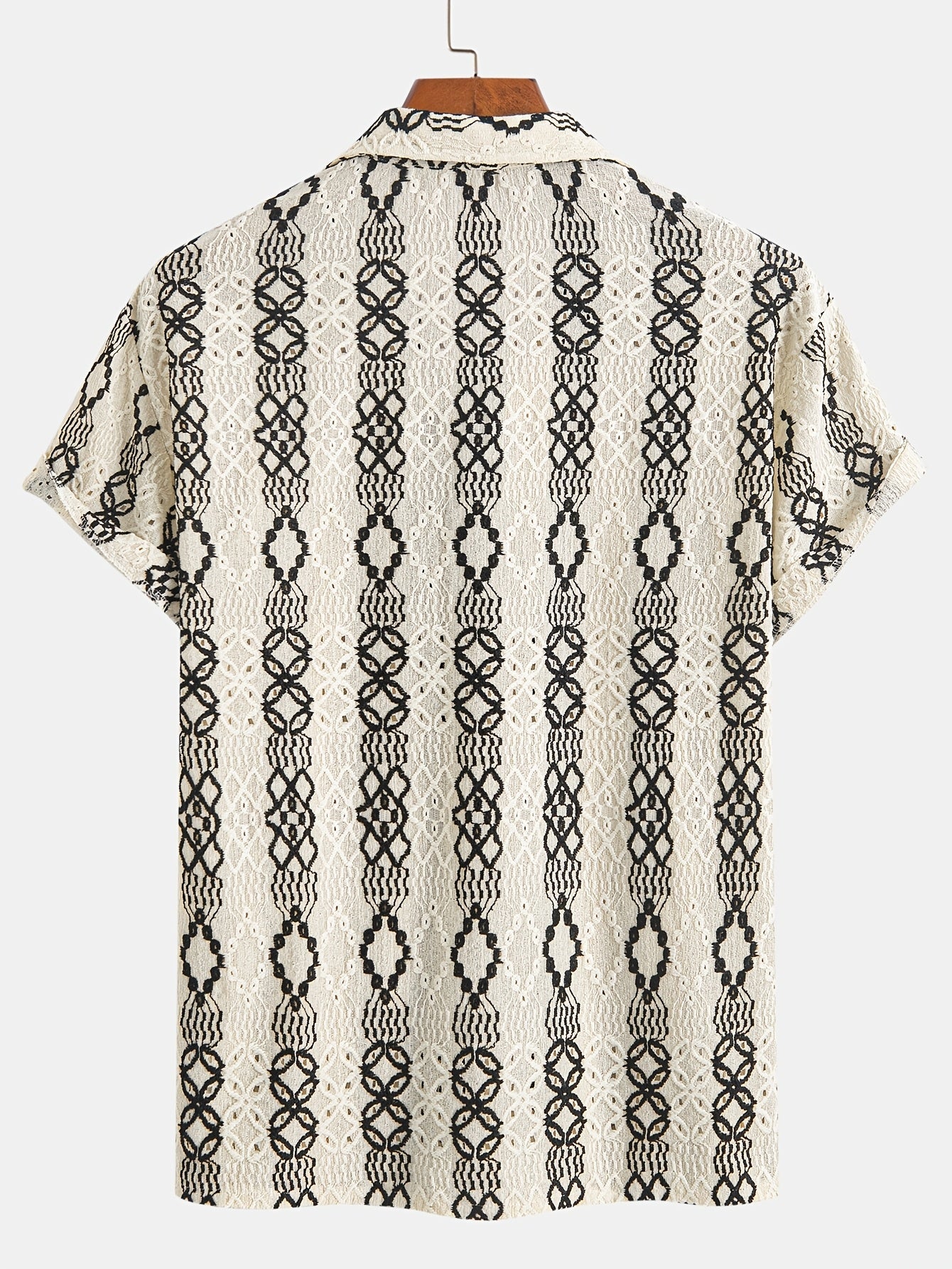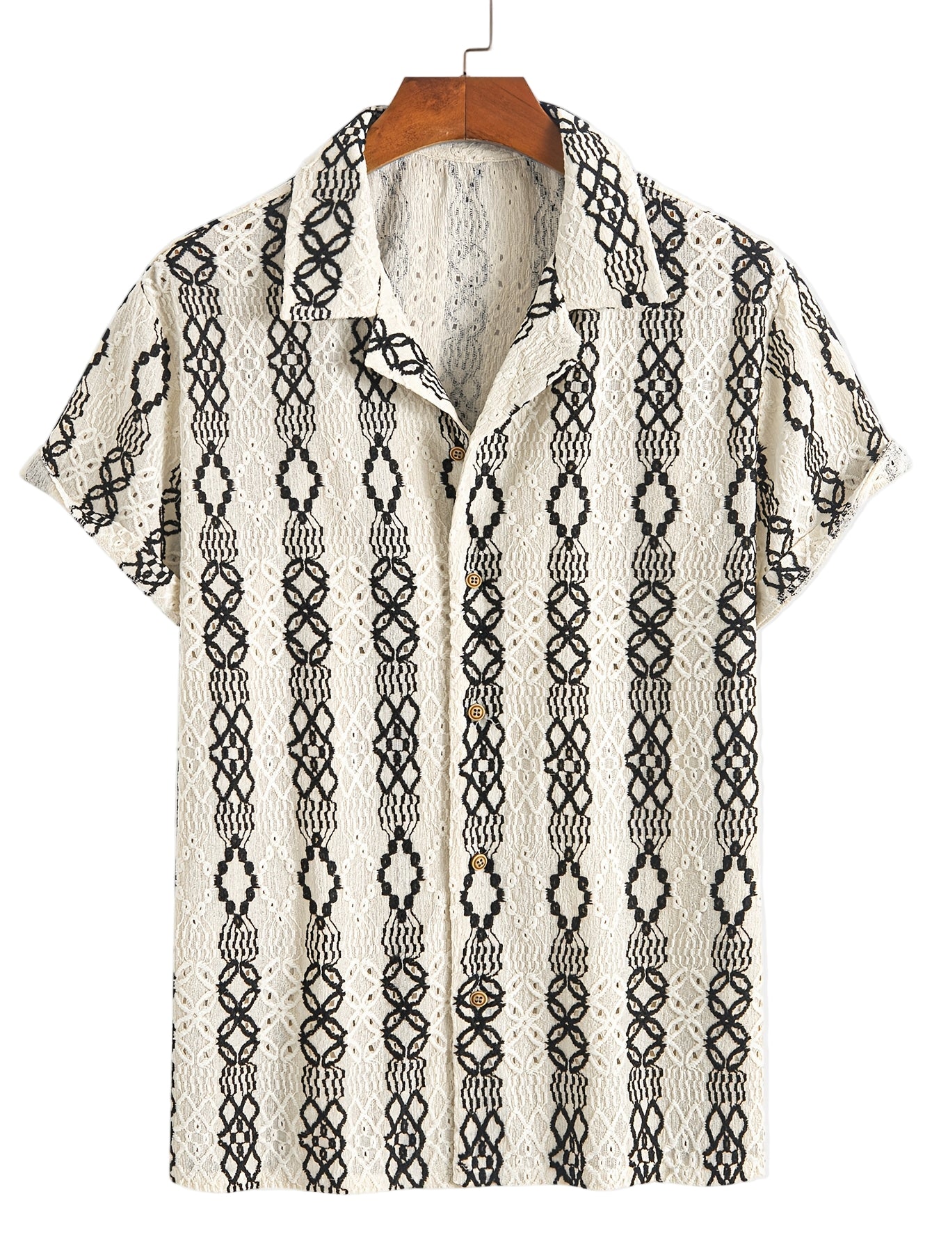 Tämä kesäpaita on suunniteltu miehille, jotka arvostavat mukavuutta kuumina päivinä. Sen tyylikäs rikkoutunut kuvio ja koristeellinen pystysuora kirjonta luovat modernin ja rennon ilmeen, joka erottuu joukosta.